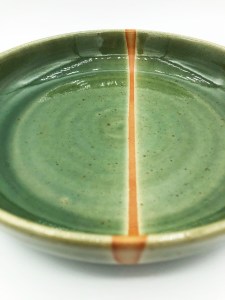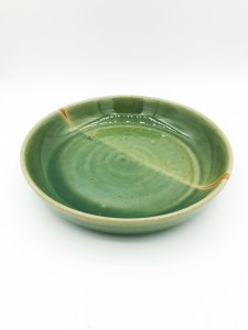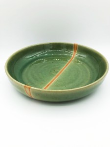 Assiette creuse ronde avec une ligne épurée et des couleurs qui claquent, pour présenter vos plats et habiller vos tables avec originalité. En grès de Saint-Amand, émail Vert craquelé avec irisation orange au contact de la terre brute.
