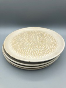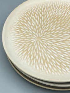 Assiette à dessert tournée, puis griffée pour faire apparaître le décor. L’émail se love dans les creux, faisant rayonner le motif dans l’assiette. En grès de Saint-Amand, décor émail Blanc satin. À associer avec le bol Diska pour un ensemble graphique et doux.