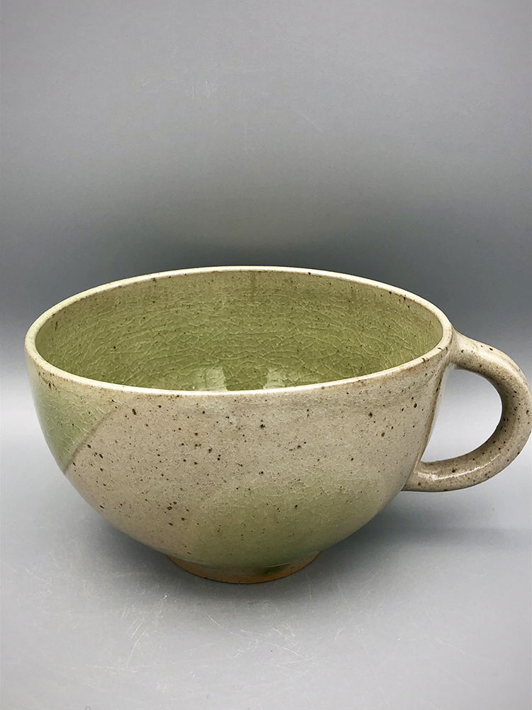 Pour les amateurs de thé et les gros mangeurs du petit-déjeuner ! Un bol sobre et élégant, au pied fin et à la ligne courbée, qui apporte douceur et réconfort. Une anse a été ajoutée au bol grande taille pour améliorer la préhension de la tasse qui se réfugie dans la main pour tenir chaud. En grès de Saint-Amand, plusieurs décors sont disponibles : émail Vert enneigé, émail Orage, émail Rouge Forge, ou superposition émail Vert enneigé et émail Blanc satin. Le rendu varie selon le type de cuisson, au bois ou au four électrique.