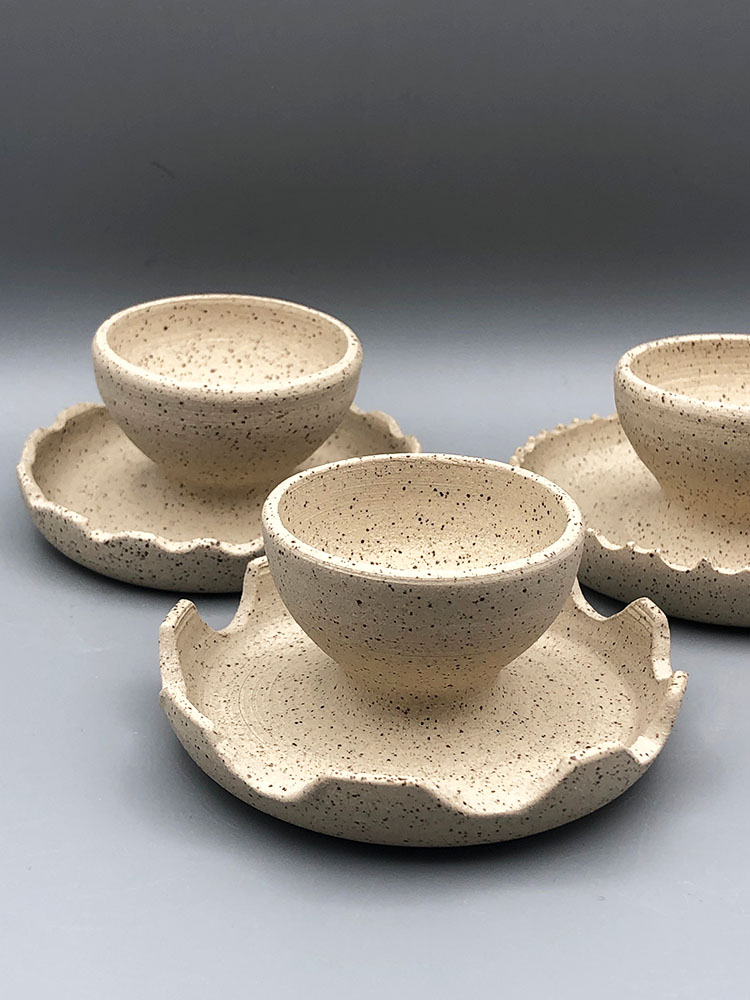 Un coquetier avec soucoupe dentelée, pour vos œufs à la coque ! Sobre, à l’aspect et au toucher rugueux, en une seule pièce pour récupérer les coquilles. En grès blanc pyrité, il existe avec et sans émail brillant (sans émail sur les photos).