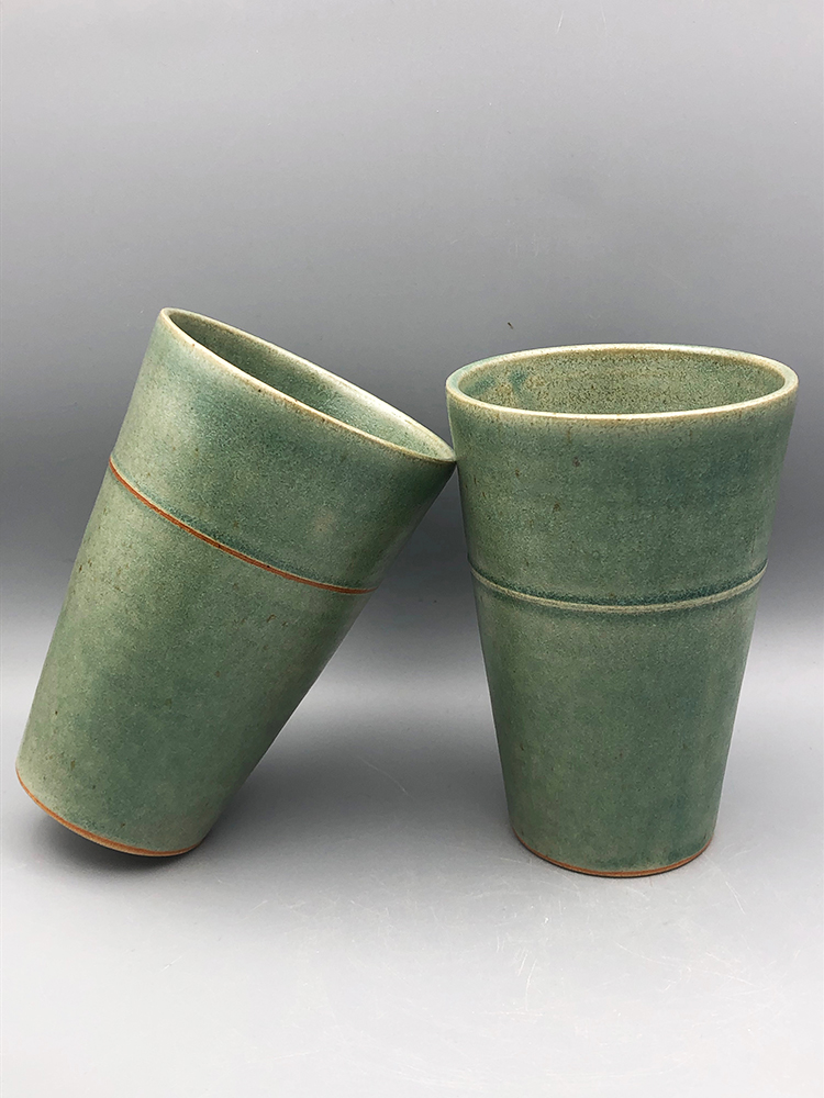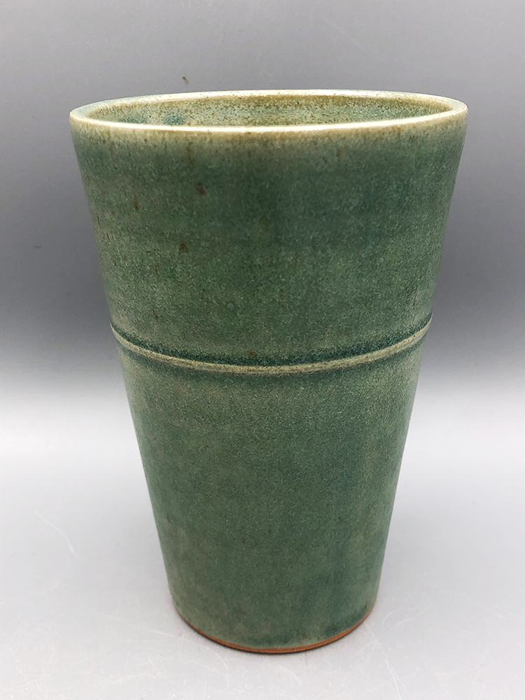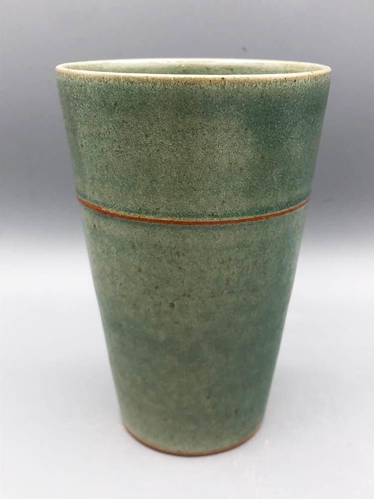 Un grand gobelet sans anse, sobre et élégant, à la ligne tendue, qui se réfugie dans la main, qui vous apporte douceur et réconfort. En grès de Saint-Amand, plusieurs décors sont disponibles. Émail : émail Vert enneigé. La ligne orange, provoquée par la rencontre entre l’émail et la terre, vient rehausser l’ensemble.