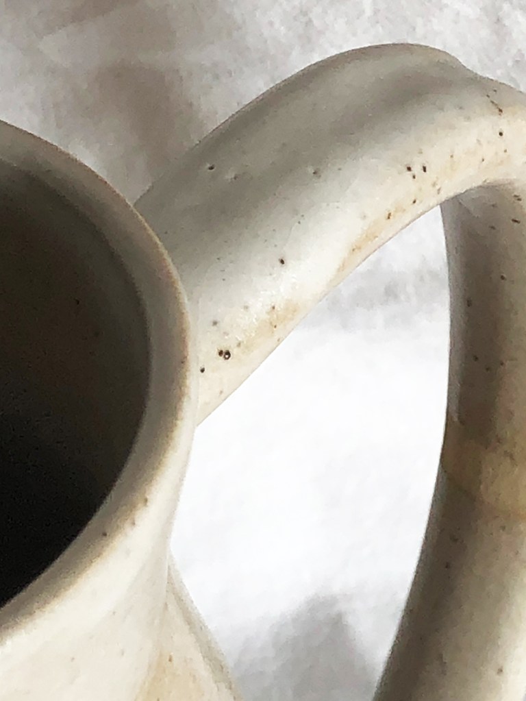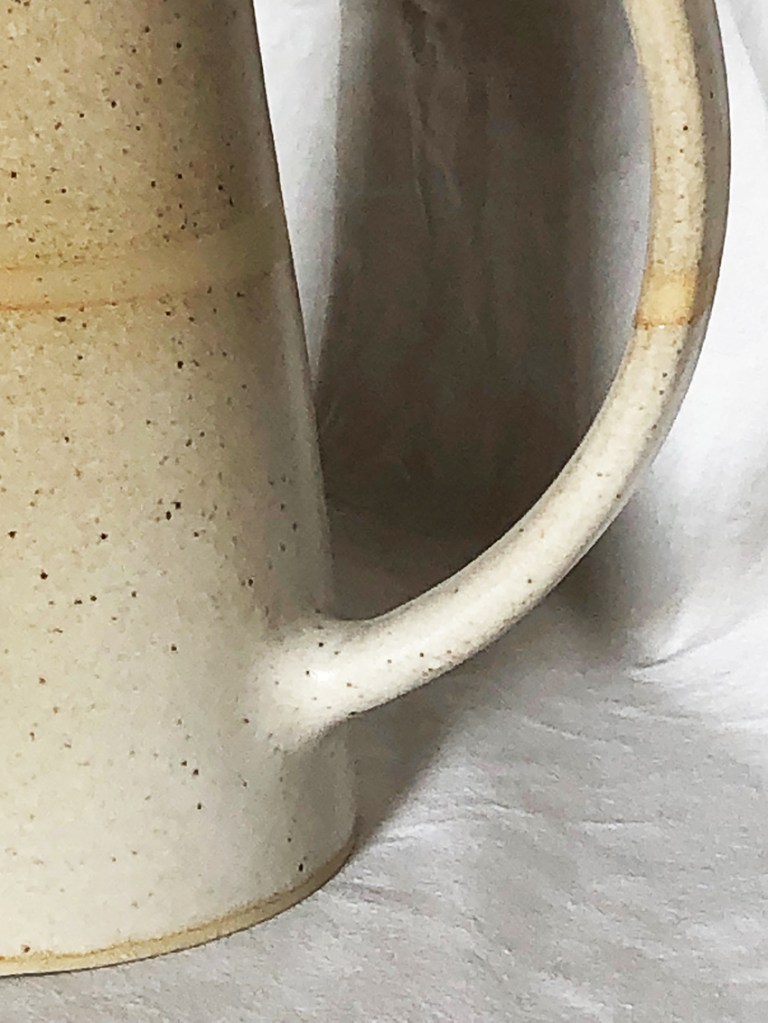 La ligne est droite, tendue et cônique, ce pichet habillera votre table avec vivacité et douceur. Tachetée de noir, la terre est parfois brute, parfois comme du sucre glace. En grès de Saint-Amand, avec l’émail Blanc satin.