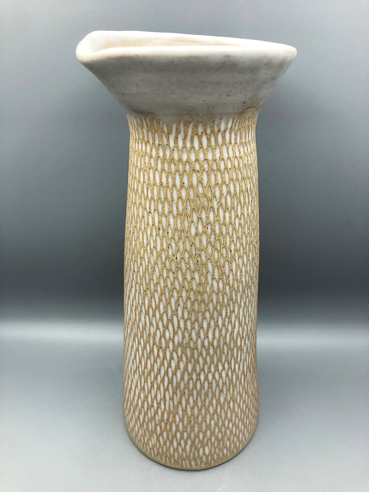 Tout en sobriété, ce haut pichet conique habillera votre table avec originalité. La main se pose autour du cou du pichet pour une préhension confortable, et verser tout en douceur. La paroi texturée offre une grande adhérence et un décor vibrant grâce aux variations de couleurs. En grès de Saint-Amand, plusieurs décors sont disponibles : émail Vert enneigé, émail Blanc Satin. Sa contenance est de 60cL.