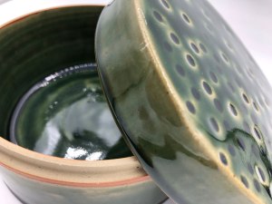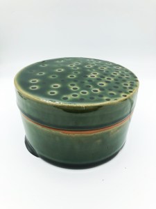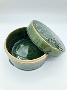 Boîte avec couvercle, pour ranger vos bijoux ou vos secrets. En grès de Saint-Amand. Plusieurs décors sont disponibles : émail Vert enneigé, émail Vert sapin brillant, ou émail Vert craquelé.