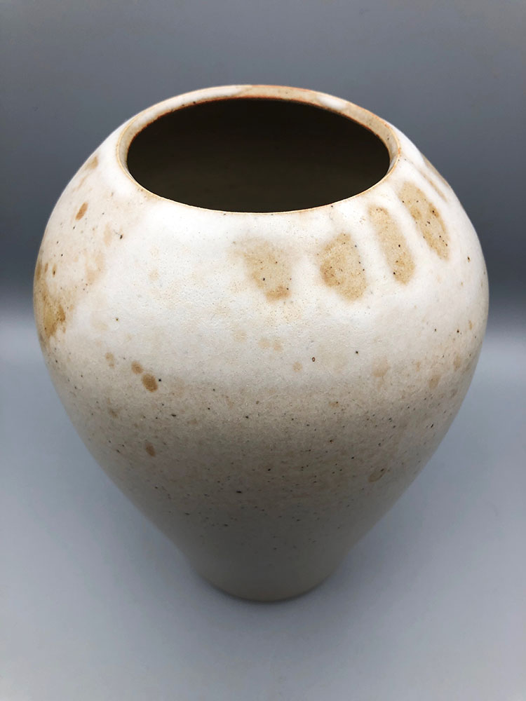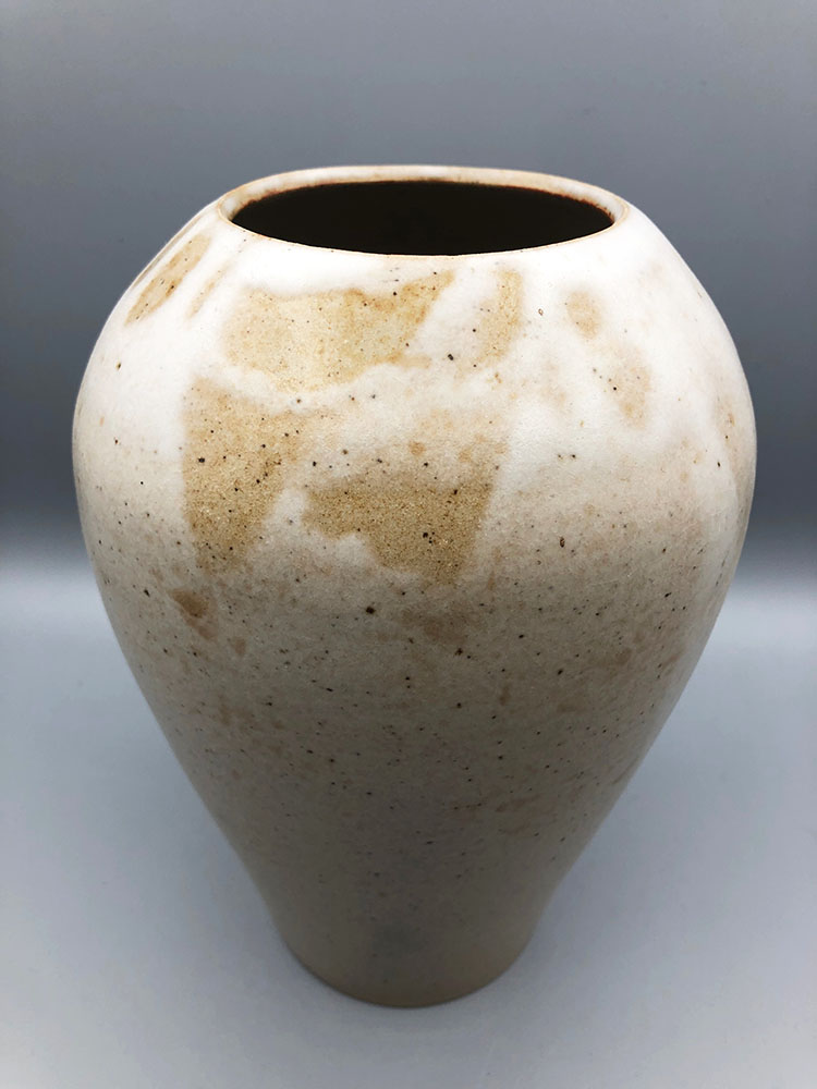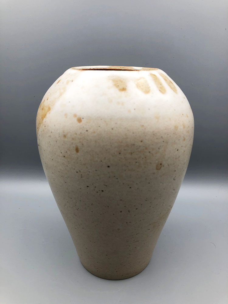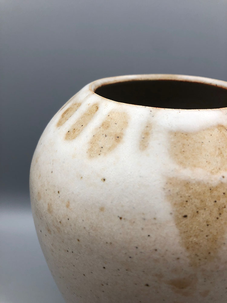 Vase au pied étroit, à l’épaule ronde et large, pour décorer votre intérieur et présenter vos compositions florales avec originalité. En grès de Saint-Amand, émail blanc satin, projection de jus d’oxyde de manganèse. La terre est tachetée de noir, oxyde de fer dont elle est chargée naturellement.